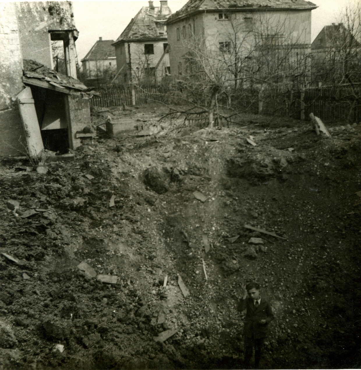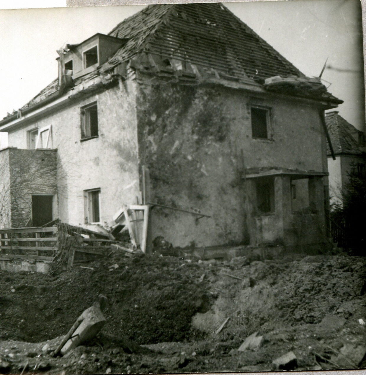 Valpichlerstraße, heute das Areal zwischen Kirchmeier- und Heigenmoserstraße bis hin zum Hogenbergplatz. Bombentrichter im Vorgarten.
